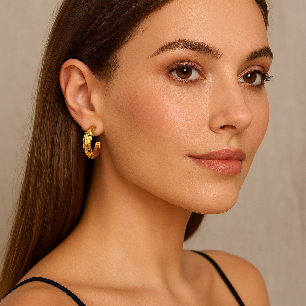 Questi orecchini da donna placcati in oro presentano un design robusto con una classica incisione geometrica, ideale per chi cerca un pezzo di carattere e personalità. La finitura lucida mette in risalto il motivo inciso con precisione, offrendo un effetto visivo di grande impatto senza essere eccessivo.